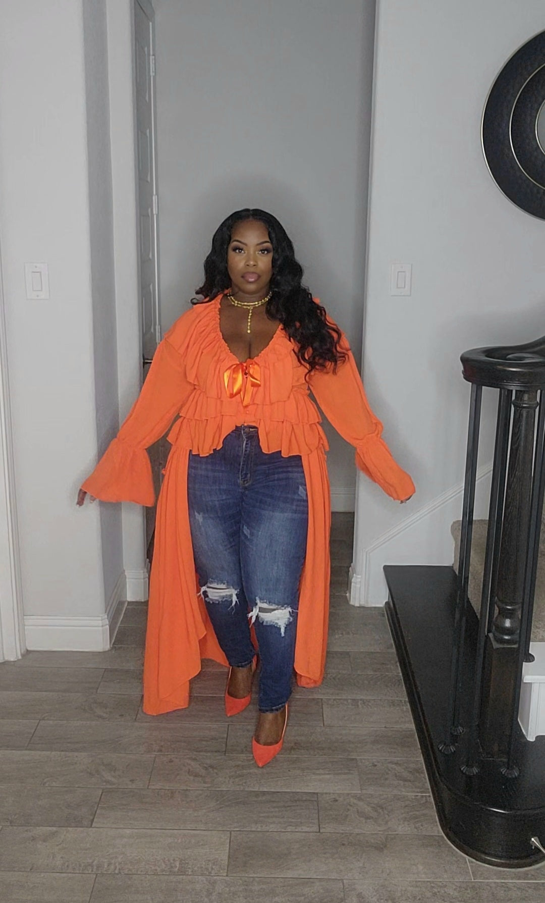 Orange. Chiffon ruffled maxi dress, front split with ribbon ties and long ruffle sleeves. Very elegant. SHOWN STYLED: as a long cardigan over jeans (jeans not sold) and can be worn off the shoulders.